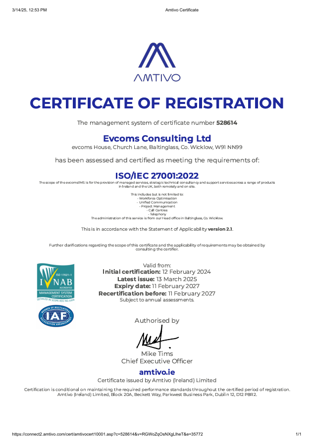 evcoms awarded ISO27001